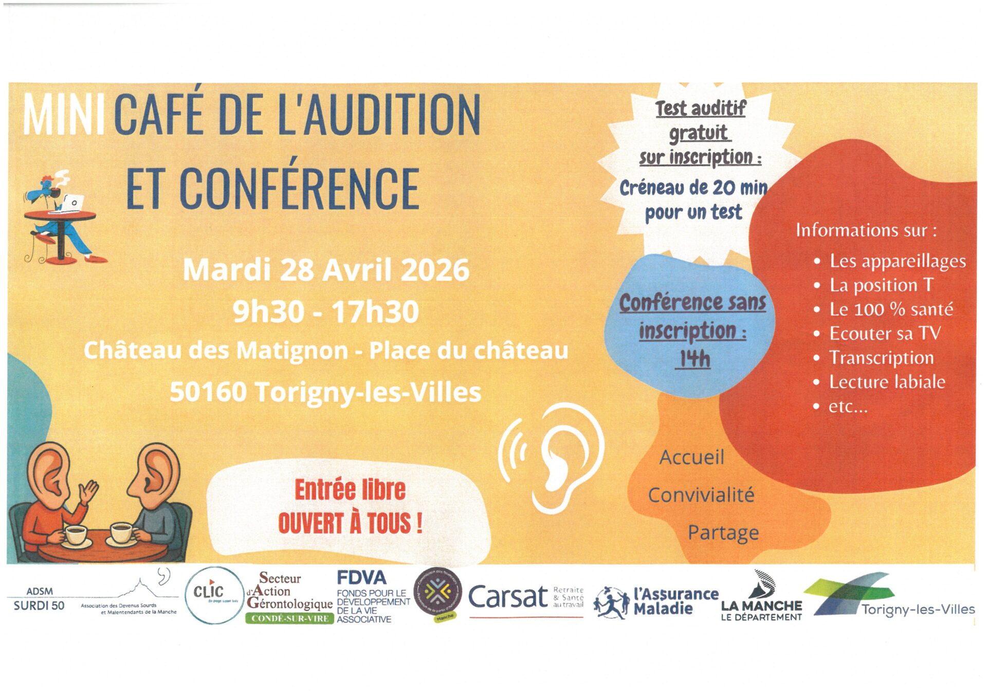 Toute la journée, des tests auditifs sur place et une conférence avec l'ADSM Surdi 50.